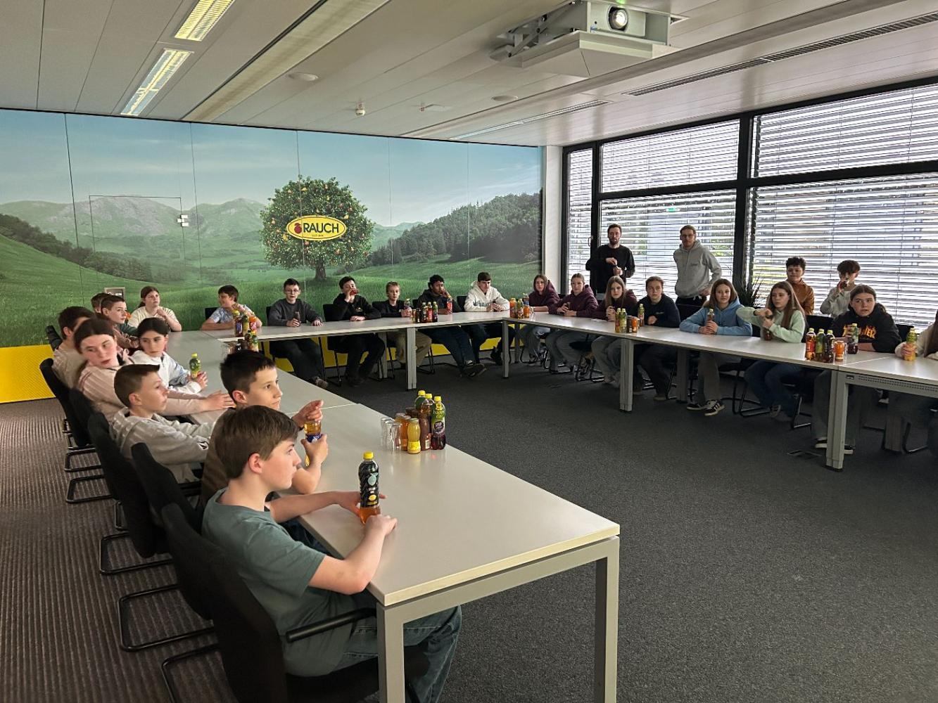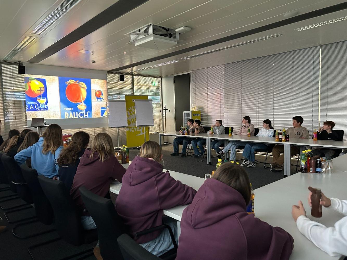 Dort wurden wir von einer Marketingmitarbeiterin herzlich empfangen und erhielten eine informative Präsentation über die Weltmarke Rauch. Dabei erfuhren wir viel über die Entstehung des Unternehmens, seine Leitvorstellungen sowie die enorme Markenvielfalt. Besonders beeindruckend war es zu hören, wie sich Rauch im Laufe der Jahre weltweit ausgebreitet und zu einem bedeutenden Player am internationalen Markt entwickelt hat.