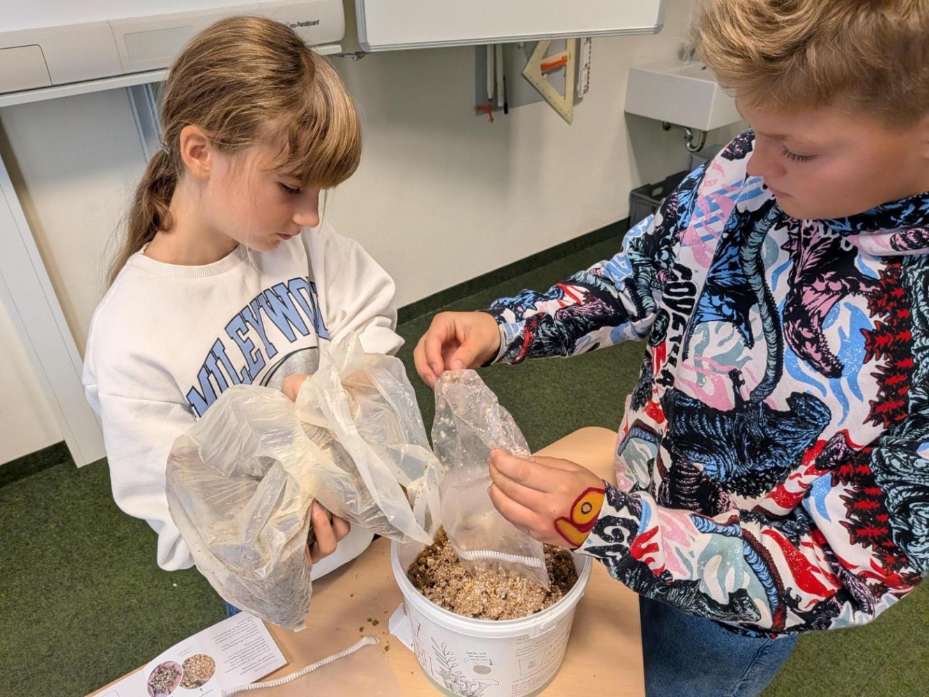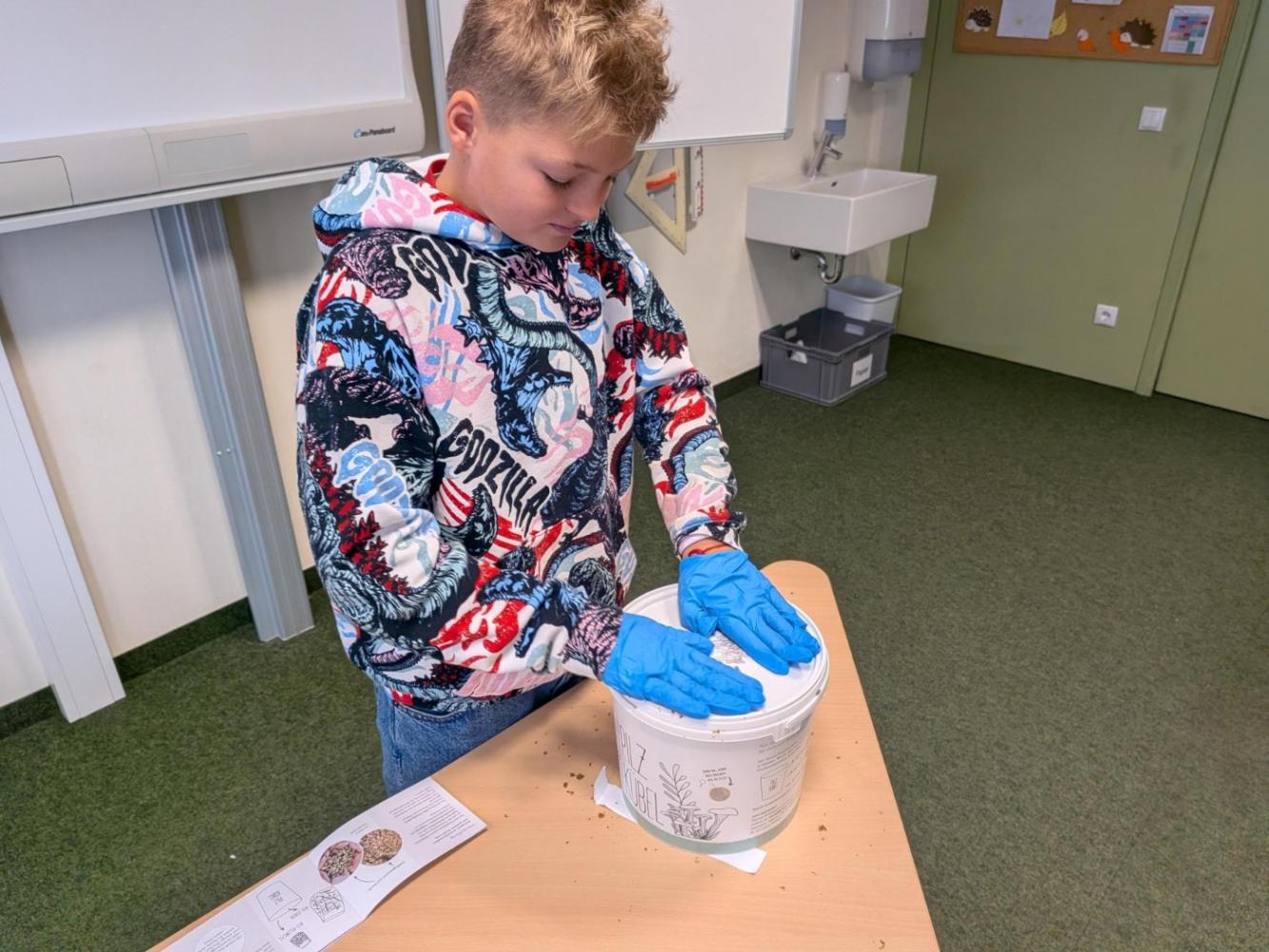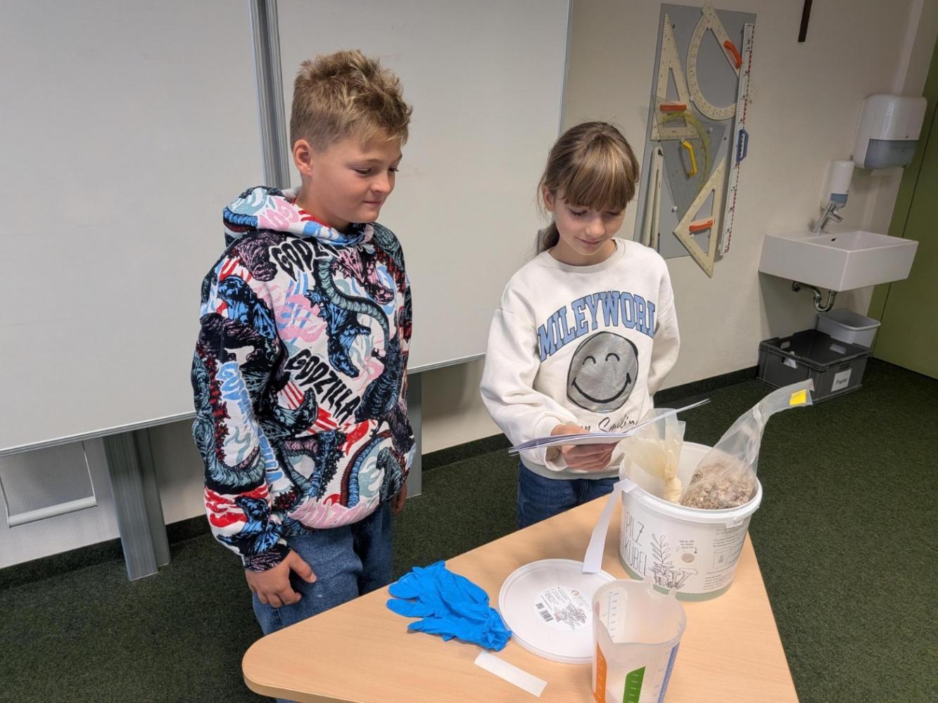 Mit großer Neugier und Begeisterung haben die Schüler:innen der zweiten Klassen ein spannendes Projekt gestartet: Im sogenannten Pilzkübel werden Waldviertler Seitlinge gezüchtet.