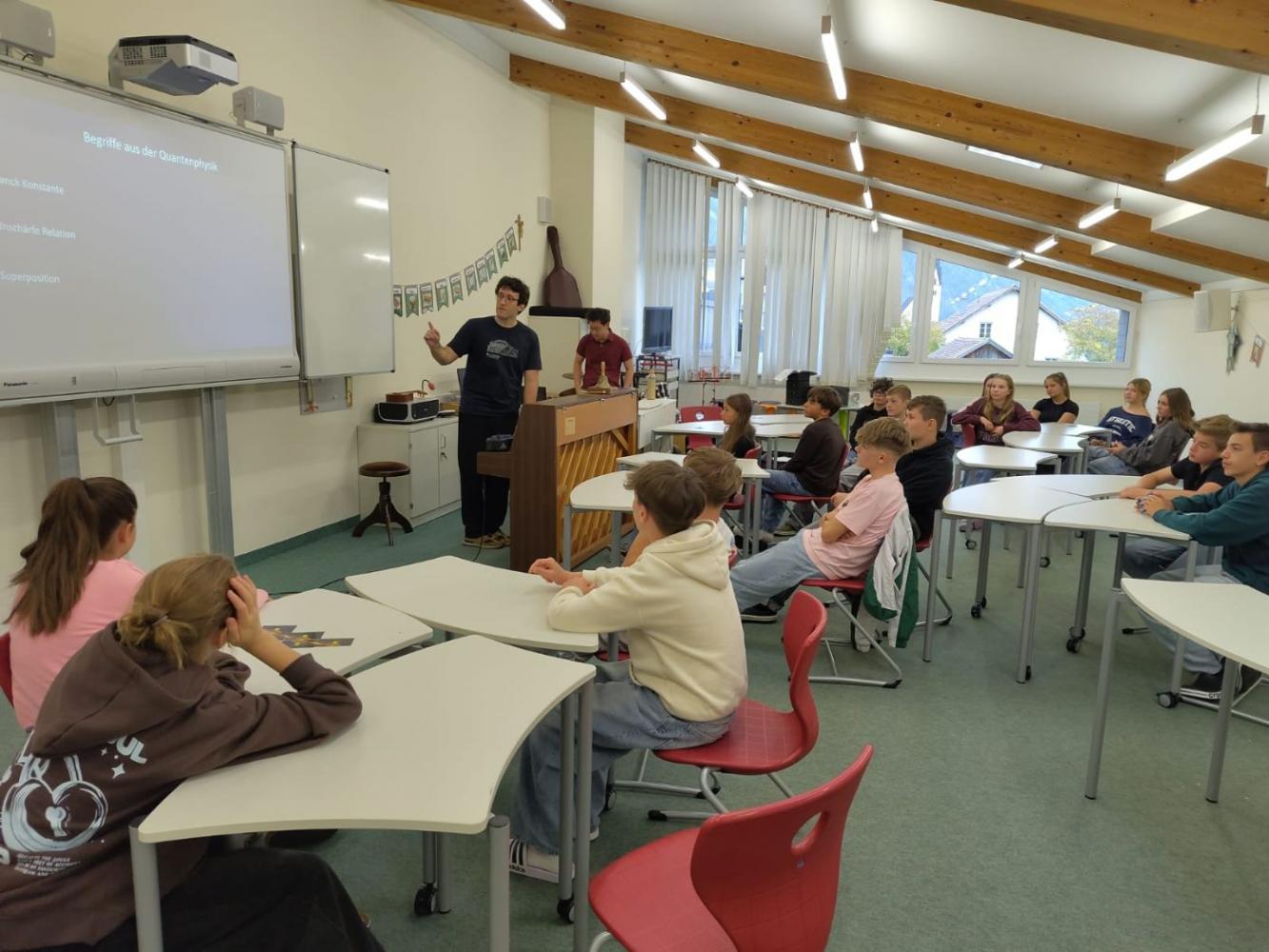 Am 15.10.2025 durften wir zwei Nachwuchswissenschaftler der Universität Innsbruck an unserer Schule begrüßen: Christian Sprenger (Institut für Ionenphysik und Angewandte Physik) und Joey Li (Institut für Theoretische Physik). Im Rahmen des Quantum@School-Projects begeisterten sie unsere Schülerinnen und Schüler mit einem interaktiven Workshop rund um die Welt der kleinsten Teilchen.